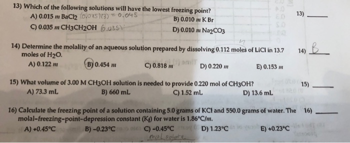 Which of the following has the lowest freezing point. Which of the following solutions has the lowest freezing point and the highest boiling point. Lower freezing point and a higher boiling point.