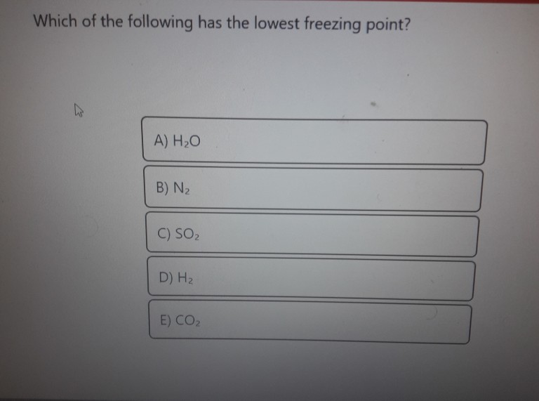 The material with the lowest freezing point is helium. Solved Which of the following has the lowest freezing point. A pure H2O B aqueous CoI2 0030 m C aqueous NaI 0030 m D.